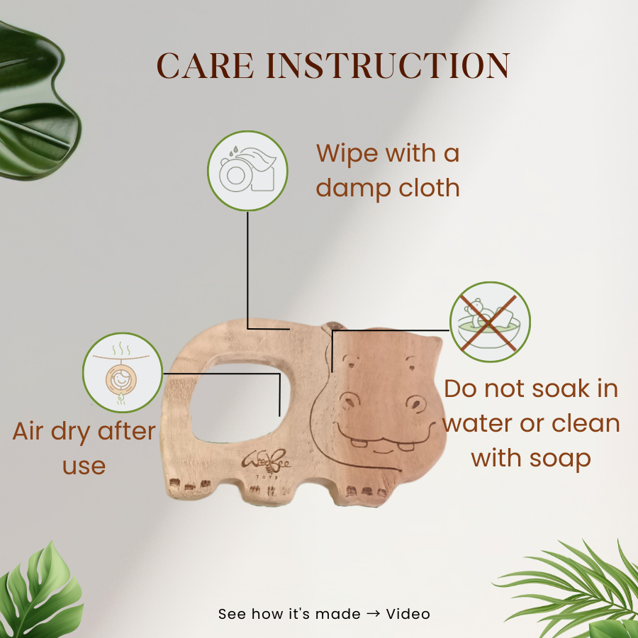 <li>For everyday care, simply wipe the teether with a soft, damp cloth and let it air‑dry completely. Avoid soaking it in water or putting it in the dishwasher, as prolonged moisture can affect natural wood. A light application of a baby‑safe oil (like food‑grade plant oil) can occasionally be used to condition the surface if desired.</li>