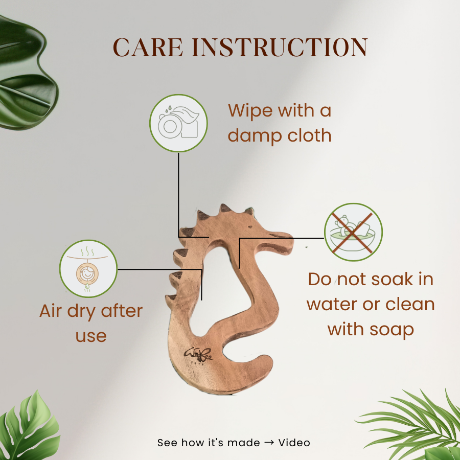 <li>For everyday care, simply wipe the teether with a soft, damp cloth and let it air‑dry completely. Avoid soaking it in water or putting it in the dishwasher, as prolonged moisture can affect natural wood. A light application of a baby‑safe oil (like food‑grade plant oil) can occasionally be used to condition the surface if desired.​</li>