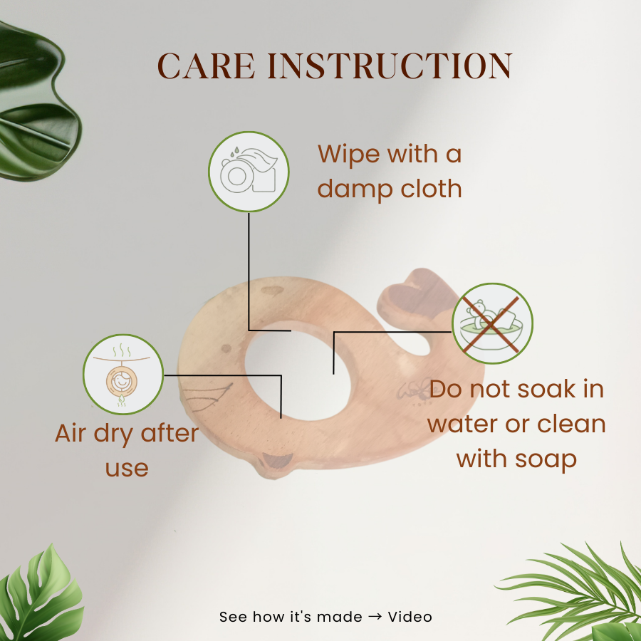 <li>For everyday care, simply wipe the teether with a soft, damp cloth and let it air‑dry completely. Avoid soaking it in water or putting it in the dishwasher, as prolonged moisture can affect natural wood. A light application of a baby‑safe oil (like food‑grade plant oil) can occasionally be used to condition the surface if desired.​</li>